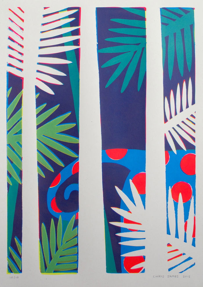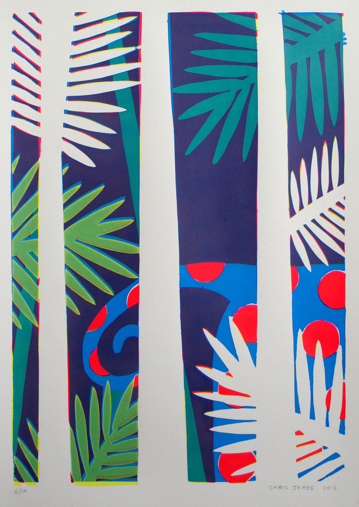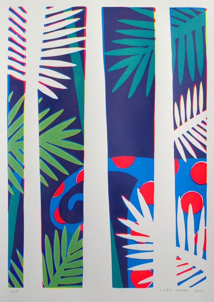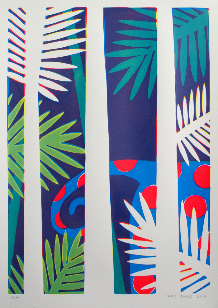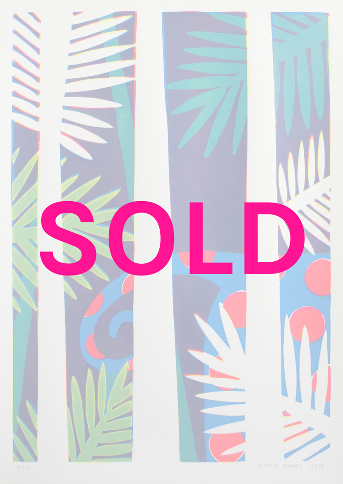4 layer screen print Created with hand-cut paper stencils 362mm x 510mm Layer colours (Yellow/Fluoro Magenta/Cyan/Yellow) 300gm off-white recycled paper Signed edition of 10