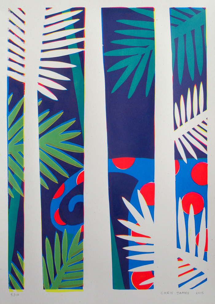 4 layer screen print Created with hand-cut paper stencils 362mm x 510mm Layer colours (Yellow/Fluoro Magenta/Cyan/Yellow) 300gm off-white recycled paper Signed edition of 10